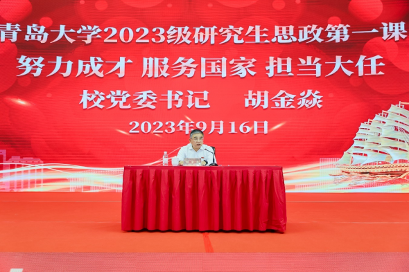 新生入學教育上,胡金焱以“努力成才,服務國家,擔當大任”為主題向同學們講授了思政第一課。他首先祝賀同學們考入青島大學,然后從時代、國家、學校三個維度闡述了高層次人才培養的重要性和緊迫性性,并對同學們提出囑托和希望。