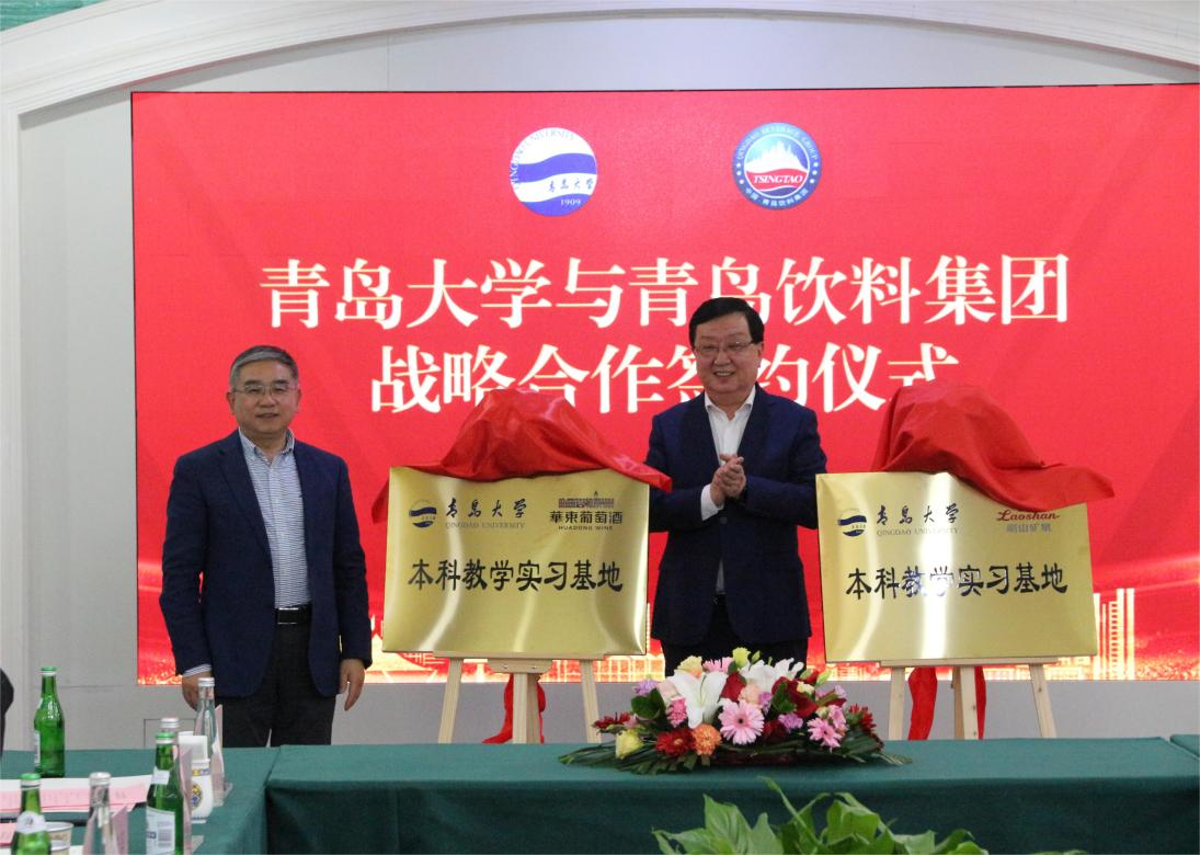 會(huì)上,胡金焱與王達(dá)為“青島大學(xué)-青島嶗山礦泉水有限公司本科教學(xué)實(shí)習(xí)基地”“青島大學(xué)-青島華東葡萄釀酒有限公司本科教學(xué)實(shí)習(xí)基地”揭牌。劉彩云與劉富華簽署雙方戰(zhàn)略合作協(xié)議。