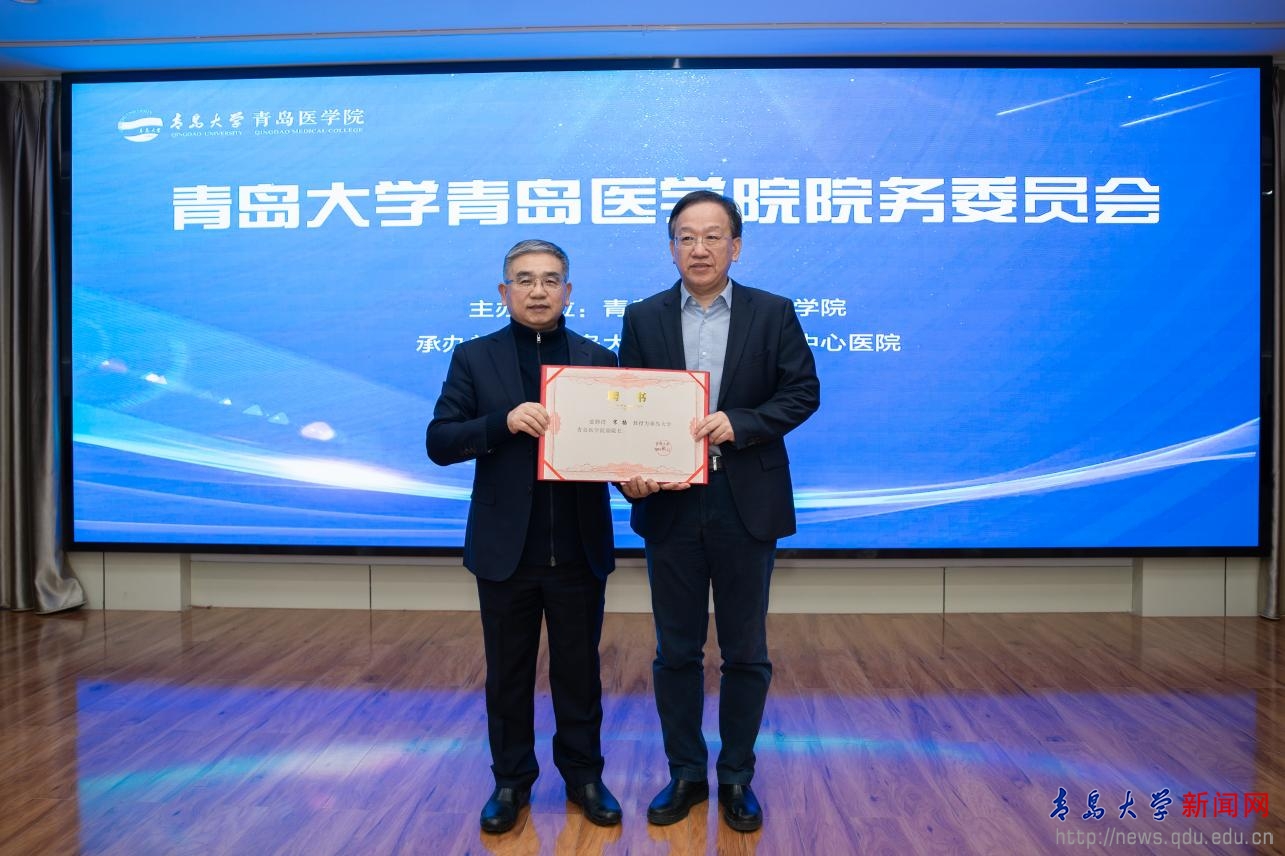 會前,李榮貴宣讀《關于調整青島大學青島醫學院院長、副院長聘任及院務委員會的通知》。胡金焱為新任院長、副院長頒發聘書。