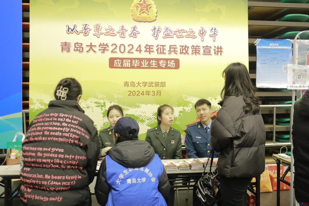 在雙選會現場的獨立區域設立了“三大就業賦能區”,包括政策服務宣傳區、就業指導區以及征兵入伍宣傳區,邀請青島市人社局工作人員、校內引航生涯發展咨詢室咨詢師、青核先鋒營政策宣傳員等專業人士為畢業生提供相關領域的咨詢服務。