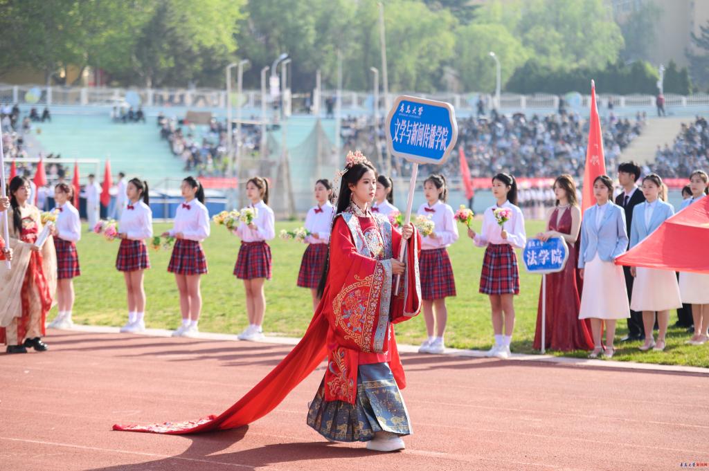 運動員入場式上,國旗護衛隊以及各院(部)方隊,邁著鏗鏘有力的步伐,神采飛揚地走過主席臺,用激情嘹亮的口號和各具特色的表演展現出青大學子激情澎湃、朝氣蓬勃的青春風采。
