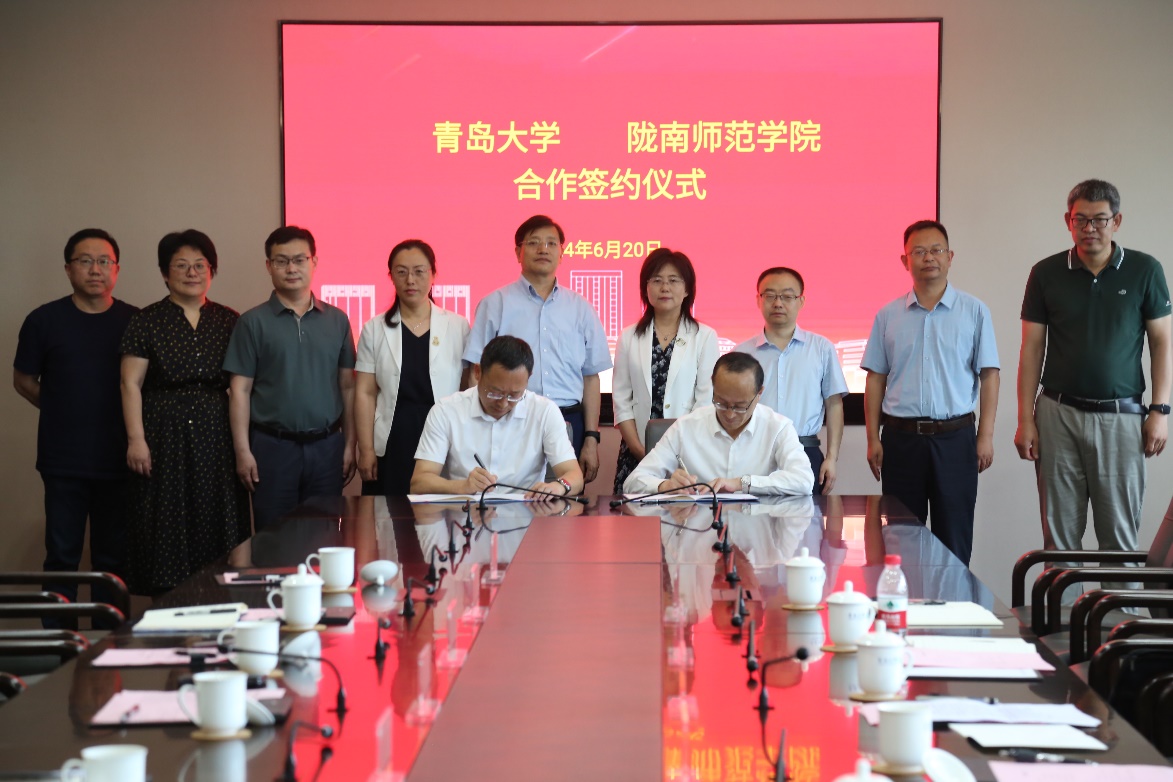 會上,劉恩賢與何新征簽署青島大學對口支援隴南師范學院框架協議。根據協議內容,我校將利用自身優質資源,通過構建高站位、深層次、全方位、立體式對口支援體系,全面推動隴南師范學院學科專業建設、師資隊伍水平、人才培養質量、科研服務能力、管理水平顯著提升,助力隴南師范學院建設成為師范特色鮮明、區域影響較大的應用型本科院校。