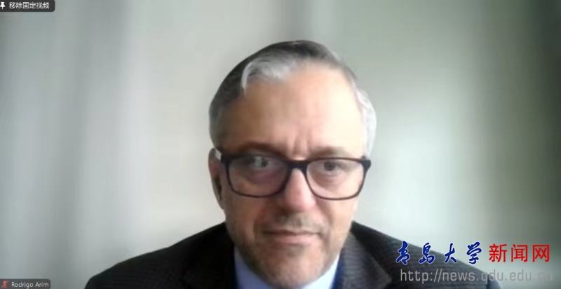 何飛代表我國駐烏拉圭大使館對(duì)論壇的舉辦表示熱烈祝賀。他指出,建交36年來,中烏兩國始終堅(jiān)持相互尊重、平等相待、合作共贏,取得了豐碩成果。兩國元首會(huì)見時(shí),習(xí)近平主席指出,中烏雙方要促進(jìn)文化、體育等人文交流,為兩國人員往來創(chuàng)造更多便利條件。中烏兩國在醫(yī)學(xué)科研等領(lǐng)域合作方興未艾,潛力巨大。2023年兩國元首見簽《中烏生物納米制藥聯(lián)合實(shí)驗(yàn)室諒解備忘錄》,為實(shí)驗(yàn)室建設(shè)打下堅(jiān)實(shí)基礎(chǔ)。他祝愿青島大學(xué)與烏拉圭共和國大學(xué)通過此次活動(dòng)深挖合作潛力,扎緊信任紐帶,實(shí)現(xiàn)智力聚合,增進(jìn)兩國人民福祉,推動(dòng)中烏醫(yī)學(xué)科研和教育領(lǐng)域合作再上新臺(tái)階。