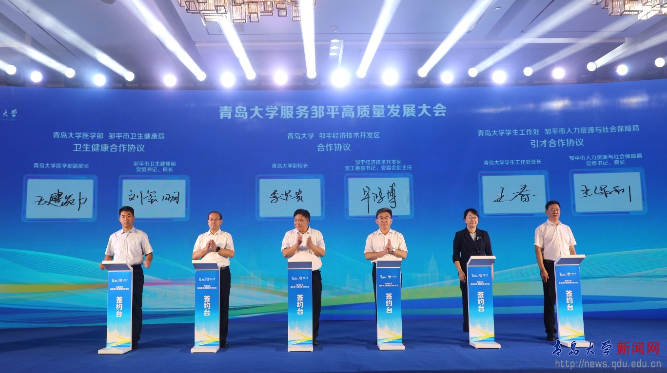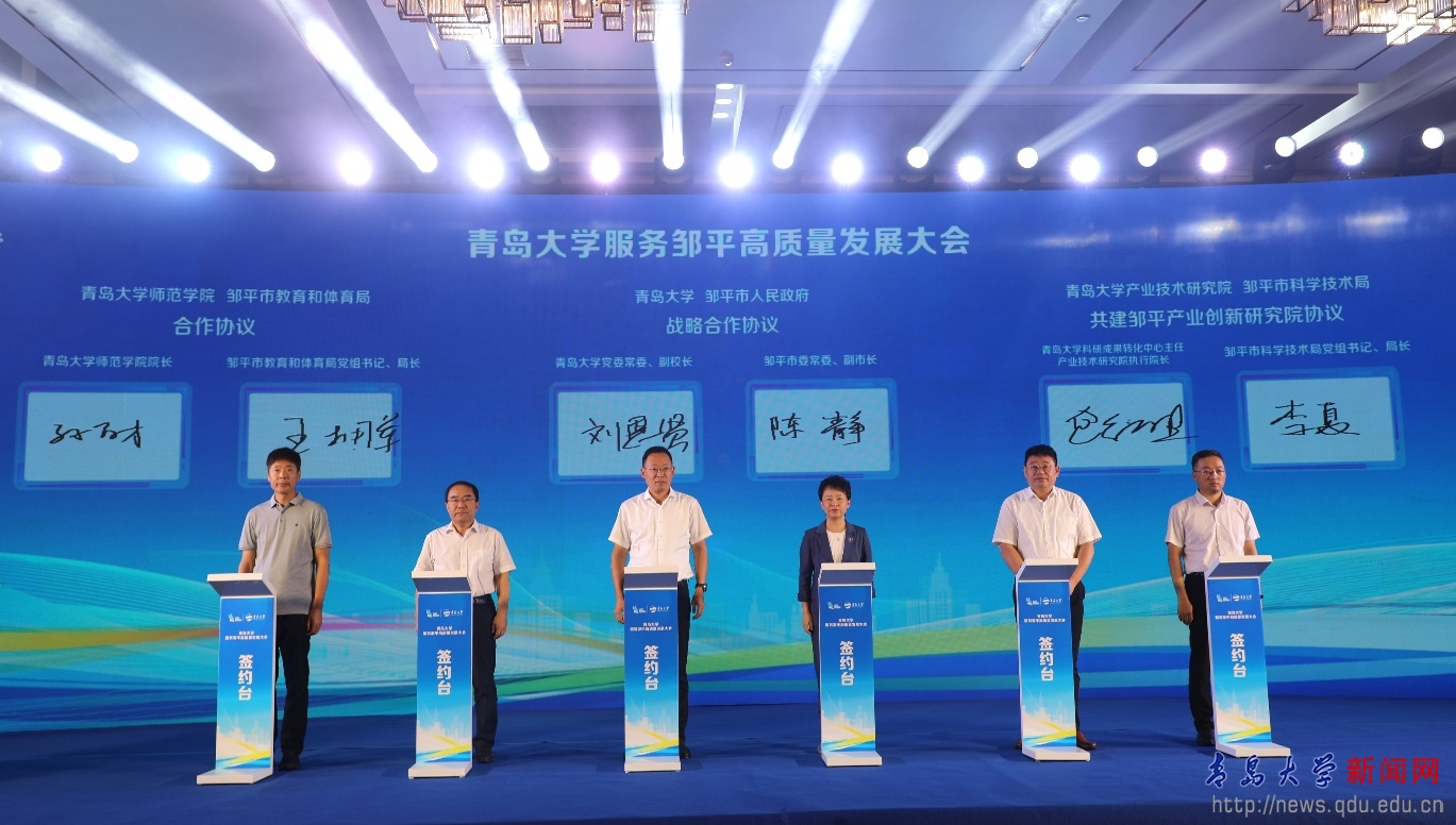 在大會上,胡金焱與呂明濤為青島大學鄒平產業創新研究院揭牌;劉恩賢與陳靜簽訂校地戰略合作協議;科研成果轉化中心主任、產業技術研究院執行院長鮑文勝與鄒平市科學技術局黨組書記、局長李夏簽訂共建鄒平產業創新研究院協議;師范學院院長孫百才與鄒平市教育和體育局黨組書記、局長王擁軍簽訂合作協議。