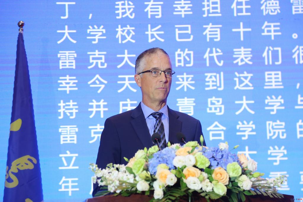 現(xiàn)任世界糧食獎(jiǎng)基金會(huì)主席、美國(guó)前駐華大使、艾奧瓦州前州長(zhǎng)特里·布蘭斯塔德先生發(fā)來(lái)了祝賀視頻,為同學(xué)們送上了最真摯的祝福。威斯康星大學(xué)奧克萊爾分校校長(zhǎng)詹姆斯·施密特也為典禮發(fā)表了熱情洋溢的致辭,祝賀青島大學(xué)德雷克聯(lián)合學(xué)院開(kāi)學(xué)典禮舉行。