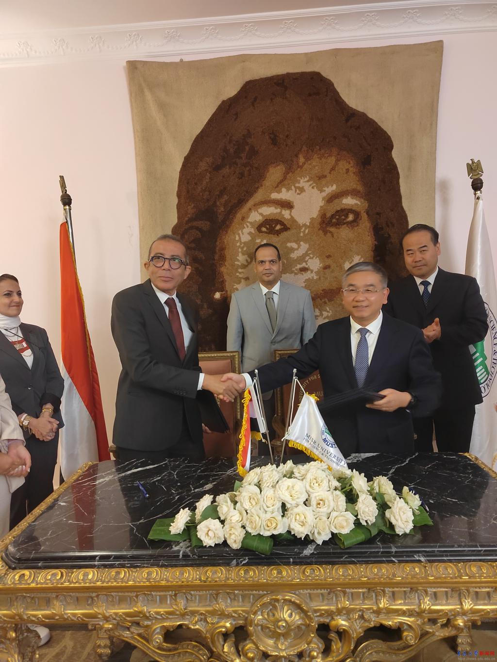 訪問埃及科技大學期間,胡金焱與埃及科技大學校長內哈德(Nehad El Mahboub)共同簽署了醫學領域和外語領域合作備忘錄。雙方同意發揮兩校學科優勢,加強外國語言文學、醫學教育和醫療資源的交流合作,建立學生互訪和教師學術交流項目,并通過聯合申報科研課題等方式推動科技合作。代表團一行還在內哈德校長的陪同下,參觀了埃及科技大學附屬醫院、醫學院、圖書館、語言和翻譯學院等院系和單位。