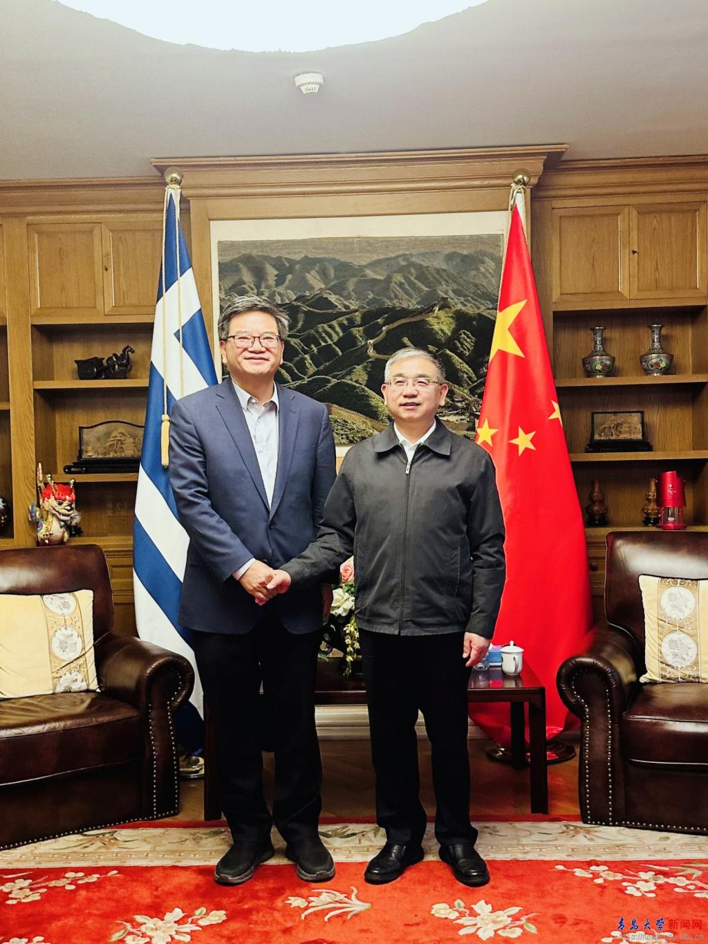 訪問期間,代表團還先后拜會了中國駐希臘大使館和駐埃及大使館。在訪問駐希臘大使館期間,駐希臘使館臨時代辦賴波對青島大學近年來發展取得的成績給予了高度評價,并介紹了當前中希兩國經貿、高等教育交流、中希文化互鑒和中文教育情況,表示將支持推進青島大學和希臘高校的交流與合作,鼓勵青島大學立足自身優勢,擴大合作的領域與范圍,通過高校間的學術交流與合作,為中希兩國友誼貢獻力量。