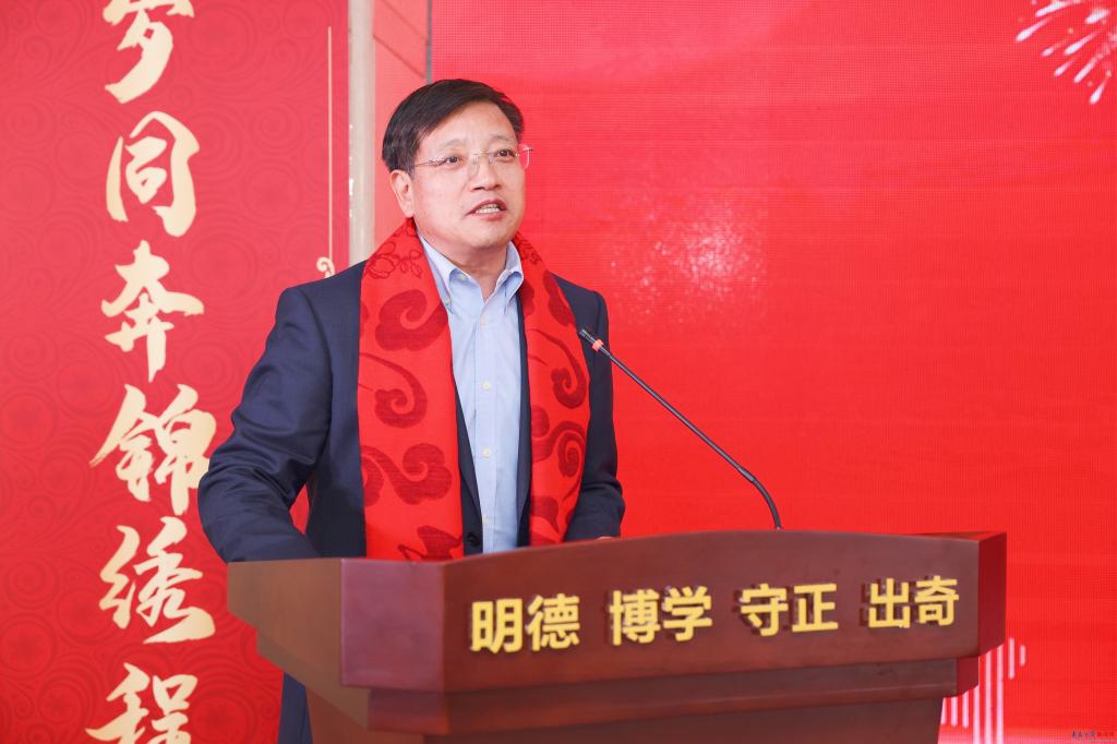 校黨委書記胡金焱致新春賀詞。他指出,2024年學校深入貫徹落實黨的二十大和二十屆二中、三中全會精神,全面落實教育強國和教育強省戰略,聚力轉型發展、創新發展、突破發展,繼往開來,積厚成勢,在高質量發展的道路上奮勇前進。他全面總結了學校過去一年在學科建設、人才培養、科學研究、社會服務、文化傳承創新、國際交流合作等方面取得的成績,通報了學校事業發展取得的標志性突破性成果。胡金焱表示,這一系列辦學成績的取得,離不開每一位青大人的傾情投入、接續奮斗,他代表學校向一年來辛勤工作在教學、科研和服務等各條戰線上的廣大教職員工表示衷心的感謝,向關心學校發展并為學校事業不斷做出新貢獻的老領導、老同志、老專家致以崇高的敬意和新春的祝福。胡金焱強調,2025年是學校全面落實第四次黨代會精神的重要一年,是實現“十四五”規劃目標任務的收官之年,也是全面提升辦學能力、加快推進“雙一流”建設的關鍵一年。學校上下要錨定目標、堅定信心,以敢打必勝的勇氣、久久為功的韌勁,踐行青大人的使命擔當,奮力開創高水平綜合性研究型大學建設新局面。