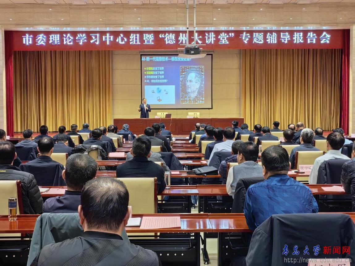 會談交流后,魏志強圍繞“新質生產力助力先進制造業強市建設”這一主題,以《AI如何賦能先進制造業?電子信息材料等場景驅動的若干AI問題》為題,在德州市委理論學習中心組暨“德州大講堂”作了專題輔導報告。