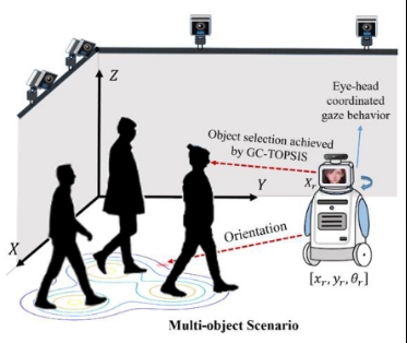 近年來,自動化學院切實推進“新工科”建設,服務國家戰略和地方經濟,積極探索高層次理工科拔尖創新人才培養的青大模式,組建了“張嗣瀛創新班”,旨在傳承張嗣瀛院士教學科研理念,培養勤于實踐、勇于創新的拔尖創新人才。朱浩宇同學入選“張嗣瀛創新班”后,在課題組于金鵬教授和劉曉瑞老師的共同指導下開展智能機器人領域的科研工作,采用EWM-Topsis模型表征并處理人類多模態社交信息,建立了基于量化社交意圖強度驅動的機器人交互注意力生成機制。在社交意圖細粒度計算與社交注意力實時更新的基礎上,提出了機器人仿人“眼-頭”協同注視的交互行為控制架構,實現了機器人自發性仿人社交行為生成與控制的全新范式。