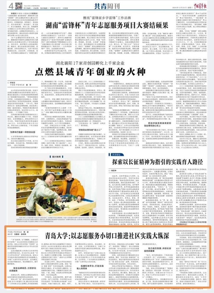 新聞網訊 12月25日,《中國青年報》以“青島大學:以志愿服務小切口推進社區實踐大縱深”為題對全校各級團組織實踐育人工作取得的經驗和成果進行了報道。文章從做實品牌項目,引領多彩志愿服務;拓建校地平臺,打造實踐育人共同體;助力地方發展,共繪社會服務新篇章三個方面,對學校各級團組織的實踐育人工作進行了介紹。