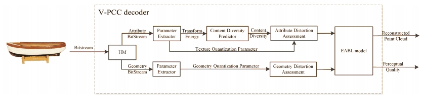《Energy-Adaptive Bitstream-Layer Model for Perceptual Quality Assessment of V-PCC Encoded 3D Point Clouds》發(fā)表于IEEE Transactions on Image Processing,第一作者是2022級研究生桑伍駟,通訊作者是蘇洪磊。針對傳統(tǒng)質(zhì)量評價需完整解碼點云的問題,該研究提出在V-PCC壓縮碼流層直接評價質(zhì)量的方法。通過分析點云視頻壓縮碼流中的變換能量和量化參數(shù)等信息,EABL模型能夠預(yù)測幾何和屬性失真,無需將點云完全解碼即可在解碼過程中實時給出質(zhì)量評價結(jié)果。在WPC2.0、M-PCCD、VSENSE VVDB等四個公開點云數(shù)據(jù)庫上的測試顯示,EABL的預(yù)測性能與需要完整解碼的全參考、部分參考方法不相上下,同時大幅提升了評價速度。該方法實現(xiàn)了點云編碼傳輸過程中質(zhì)量評價的高效化,為資源受限環(huán)境下的點云應(yīng)用提供了實用方案。提出的模型結(jié)構(gòu)如圖3所示。