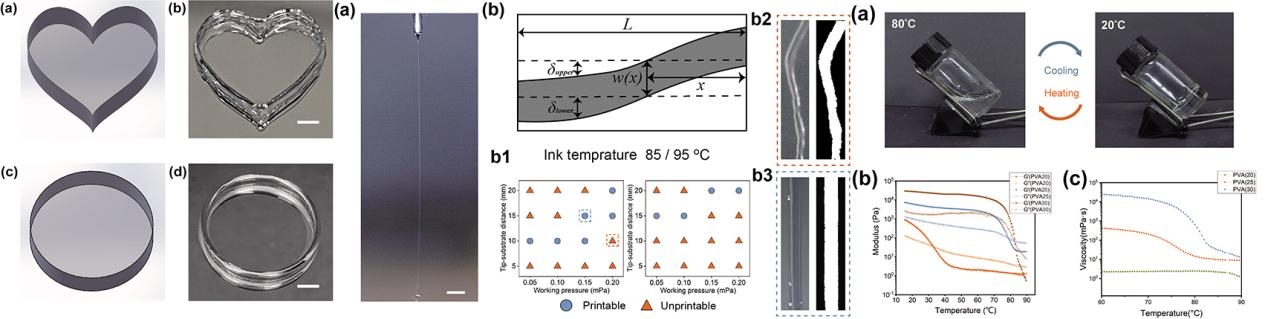 通過數(shù)百次探索,通過SGEHD技術(shù)最終將PVA凝膠生物材料支架的打印分辨率提升至70微米(精度提高超80%),并成功實(shí)現(xiàn)綠色打印,提升了生物材料的生物相容性。最終,制備出高精度、復(fù)雜拓?fù)浣Y(jié)構(gòu)的PVA水凝膠生物材料支架,該技術(shù)推動(dòng)3D打印技術(shù)的范式變革,不僅可以應(yīng)用于新一代骨骼、關(guān)節(jié)修復(fù)生物材料的設(shè)計(jì)與優(yōu)化,同時(shí)在新型可穿戴材料等領(lǐng)域具有廣闊的應(yīng)用前景。