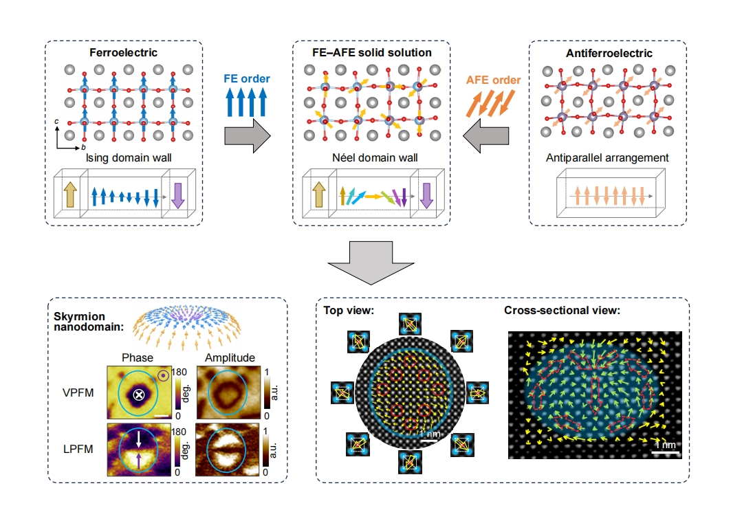 最近,極性拓撲疇,特別是極性斯格明子(Polar skyrmion)受到業界廣泛關注,其具有手性、負電容、場控二次諧波等新奇物性,并且這種拓撲孤子可以穩定在原子尺度,在超高密度數據存儲、負電容低功耗場效應器件以及高靈敏太赫茲成像等領域顯示出巨大應用潛力,這推動了鐵電拓撲電子學在新一代信息技術的持續創新發展。然而,鐵電體的“電極化-晶格”強耦合使得極性斯格明子成為能量介穩態。目前,其僅存在于少數借助復雜薄膜結構來平衡能量間相互作用的材料體系中,限制了相關電子學器件的設計、制備和CMOS系統集成。因此,探索新的極性斯格明子材料體系對于拓撲電子學的發展十分重要,但同時由于苛刻的力、電邊界條件充滿了挑戰。我們注意到極性斯格明子產生的兩個關鍵因素,即“電偶極子轉動”和“非共線極化織構有序化”,提出基于鐵電-反鐵電固溶體的斯格明子材料體系。固溶體中鐵電序與反鐵電序共存,其能量相互競爭導致電偶極子旋轉,當固溶成分恰當時,非共線電偶極子有序化形成如Néel疇壁等排列并產生斯格明子拓撲織構。該體系化學組分簡單,易于制備且魯棒性強,蘊含了拓撲極性織構形成的新機制,使得斯格明子電疇能夠廣泛存在于陶瓷和薄膜兩種材料形態中,這不僅為極性拓撲相的理論和實驗研究提供了廣闊的平臺,還促進了鐵電電子學的創新發展。