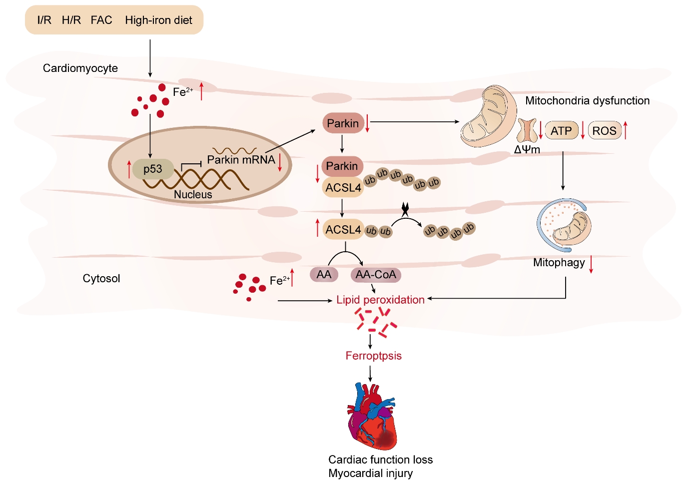 鐵作為人體內必需的微量元素,在調節各種生理過程中發揮重要作用。但是,機體內鐵過載也會導致組織器官損傷,與心血管等疾病發生密切相關。鐵死亡是依賴于鐵離子存在的一種新型程序性細胞死亡形式,心肌缺血再灌注損傷、阿霉素心肌毒性等心肌損傷模型中報道了心肌細胞鐵死亡的存在,并且使用基因修飾或藥物等手段特異性抑制鐵死亡取得了可喜的治療效果。然而,心臟鐵過載引起心肌細胞鐵死亡及心肌損傷的具體分子機制尚不清楚。該研究報道了Parkin蛋白通過抑制心肌細胞鐵死亡發揮心肌的作用和機制。在心臟中,Parkin蛋白表達水平較高,通過泛素化修飾途徑降解鐵死亡脂代謝關鍵調控因子ACSL4,抑制多不飽和脂肪酸磷脂的生成,進而抑制心肌細胞鐵死亡的發生。而在心肌梗死發生過程中,心肌細胞中鐵離子含量增加,過量的鐵激活p53,轉錄抑制Parkin的表達,促進心肌鐵死亡及心肌梗死的發生。動物實驗顯示,心臟特異性Parkin基因敲除小鼠在高鐵飲食下表現出更嚴重的心肌損傷,而鐵死亡抑制劑Fer-1顯著抑制了鐵過載誘導的鐵死亡和心肌缺血再灌注損傷。這一發現揭示了心肌梗死發病新機制,為開發以鐵死亡調控因子為靶點的心臟疾病防治提供了重要理論依據。