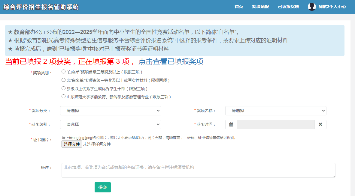 考生所有上報獲獎證書等證明材料,均以“已填報獎項”中顯示的提交成功的獲獎為準。