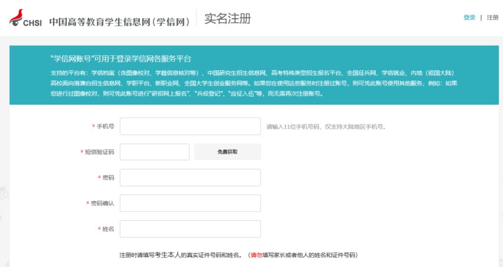 登錄報名系統需要學信網的統一賬號,已經注冊過的考生無需再次注冊,未注冊的考生需要用本人的姓名、身份證號、手機號按網上要求進行實名注冊。