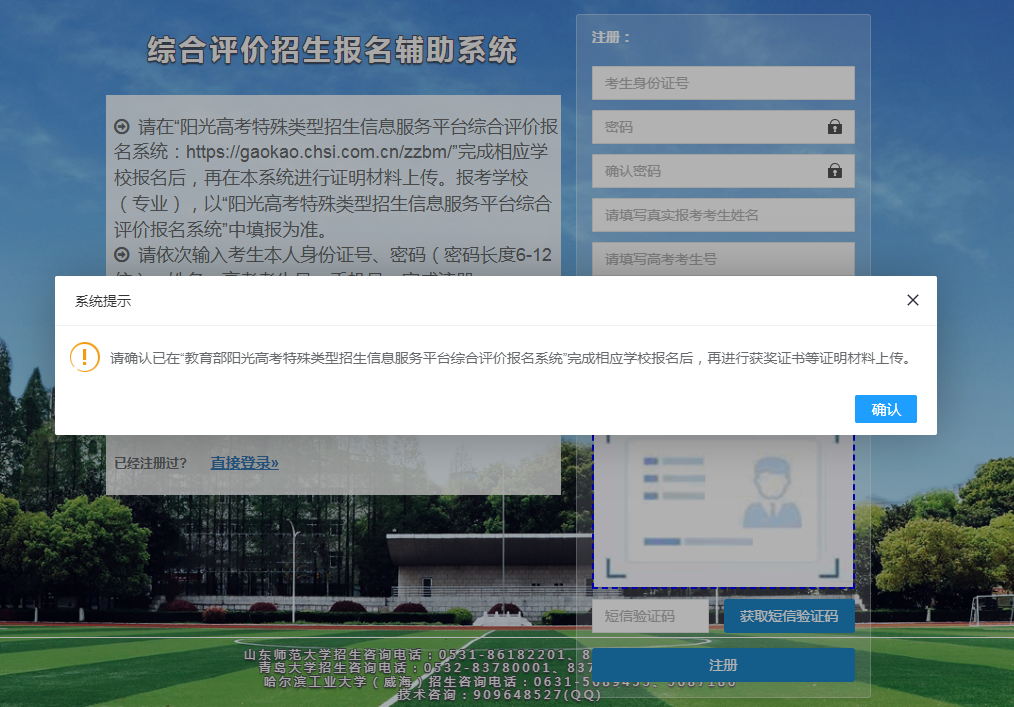(一)系統網址:http://sdyk.oumacloud.cn:85,打開網址后點擊“注冊”,注冊前請確認已在教育部陽光高考特殊類型招生信息服務平臺綜合評價報名系統完成報名,點擊“確認”。