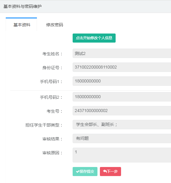 (五)在系統右上角“個人中心”中完成手機號碼、學生干部等信息采集與相關信息核對與修改,完成后保存提交,點擊下一步,進行獎項填報。