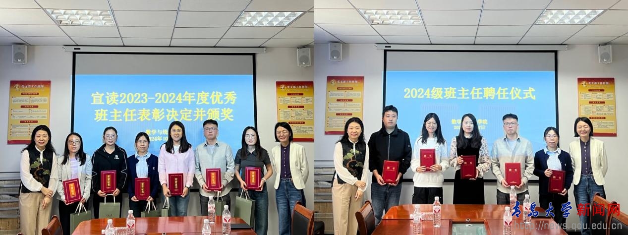 劉琪宣讀《數學與統計學院2023-2024年度優秀班主任表彰決定》向優秀班主任頒發證書和獎品,并向2024級班主任頒發聘書,對班主任的扎實工作與潛心付出表示感謝。他表示,班主任、輔導員作為學生成長道路上的引路人,應持續深化立德樹人理念,將德育工作貫育人工作始終,不斷學習提升自身專業素養與育人質量。