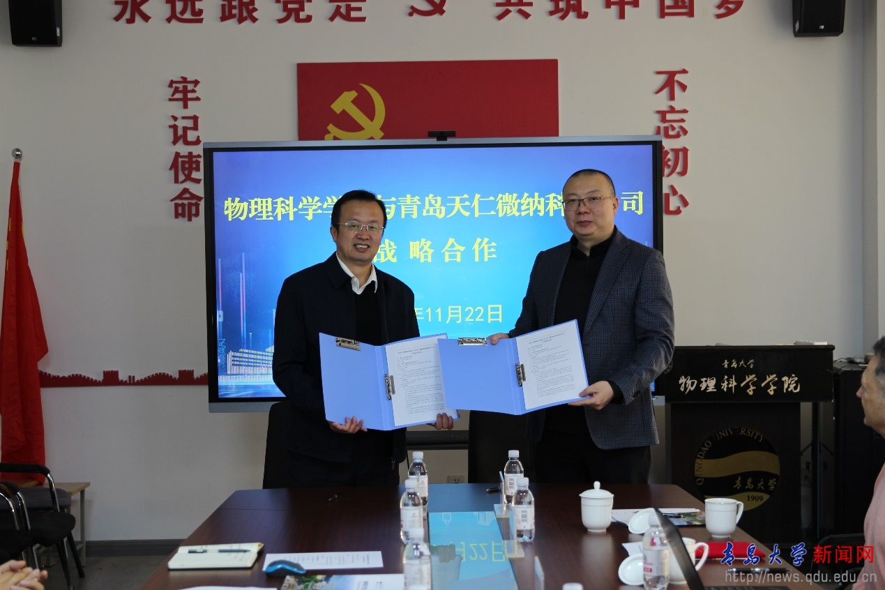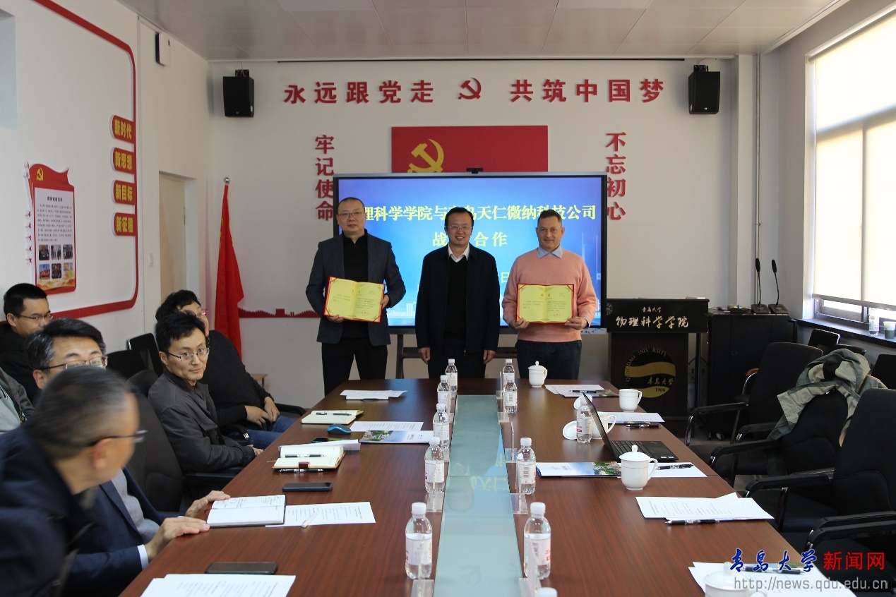 新聞網(wǎng)訊 11月22日上午,物理科學學院與青島天仁微納科技有限公司產(chǎn)學研合作簽約暨客座教授聘任儀式在博逸樓401會議室舉行。青島天仁微納科技有限公司董事長翼然博士、高級專家Massimo Tormen博士、監(jiān)事張章、HR總監(jiān)孫巖青、對外合作部董征、郝倫,物理科學學院黨委書記郝偉、副院長張永成以及學院教師、學生代表參加會議,會議由物理科學學院副院長張軍主持。