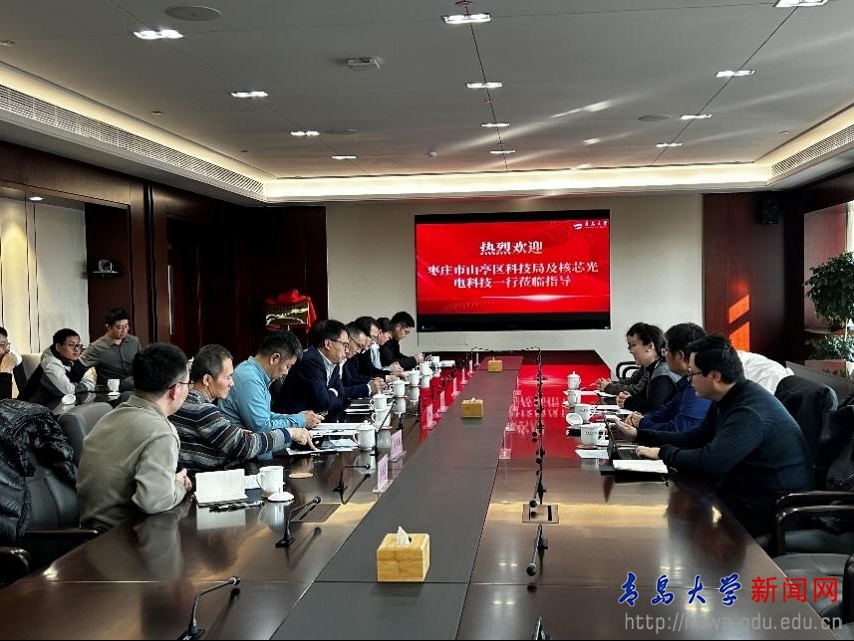 新聞網訊 2月26日下午,山東棗莊市山亭區科技局局長張穎、核芯光電科技(山東)有限公司總經理、中科院高能所曹學蕾研究員一行蒞臨我校。材料科學與工程學院黨委書記張奎勤、院長黃林軍在會議中心致遠廳會見了來訪嘉賓并舉行座談,雙方圍繞進一步深化合作展開深入交流。座談會由張奎勤主持,合作發展處副處長雷博、科研成果轉化中心副主任曲紹陽、成果轉化與專利管理辦公室主任李龍彪參加會議。