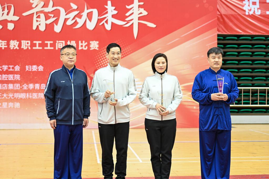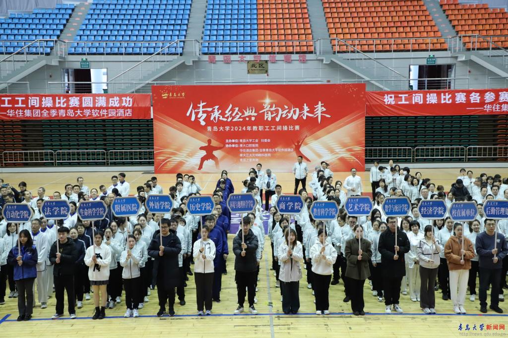 新聞網訊 11月28日下午,我校2024年“傳承經典 韻動未來”工間操比賽在浮山校區體育館舉辦。來自全校29個學院和單位的34支參賽隊伍、523名教職醫務員工同臺競技,呈現出健康活潑、充滿自信的教職工風貌。青島理工大學工會主席董典同、青島科技大學工會主席郭永、青島農業大學工會主席王清春作為比賽評委出席活動。校黨委副書記肖江南參加活動并講話。